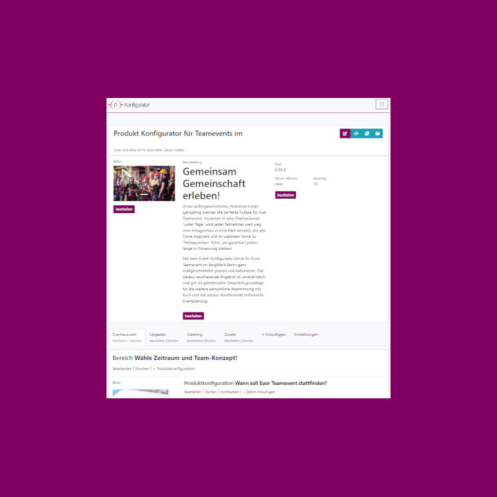 Unseren Produktkonfigurator können Sie leicht über eine intuitive Oberfläche bearbeiten. Bilder, Preise, Produkte, Optionen und unterschiedliche Zahlungsweisen werden über einen einfachen Dialog per Webbrowser gepflegt. Wir folgen hier dem Selfservice-Prinzip.