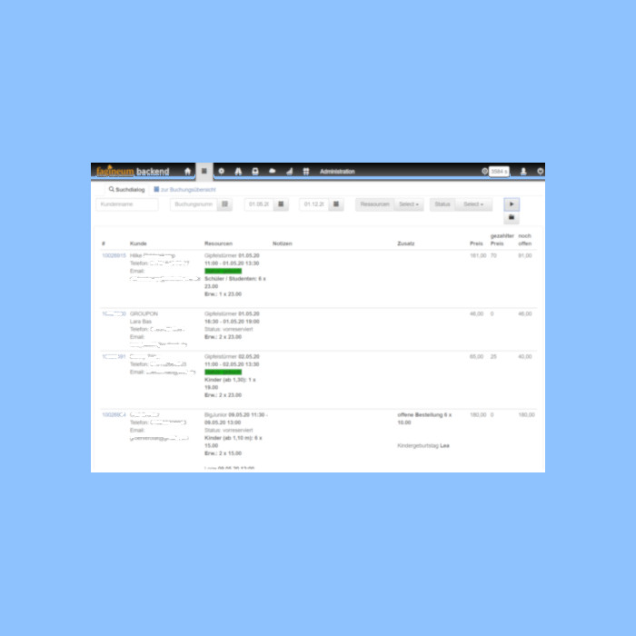Verwalten und managen Sie Ihre Buchungen und mietbares Equipment im Fagineum Backend